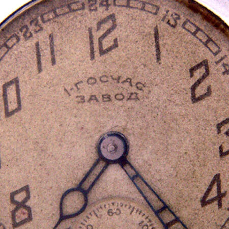 Cette montre est un prototype ou une pièce d’essai d’un calibre conçu par Dueber Hampden, assemblé à Moscou à partir de plans et de pièces obtenus lors de l’achat de l’usine aux USA (voir ici). Certaines ou toutes les pièces de cette pièce ont été fabriquées à Moscou.