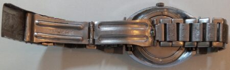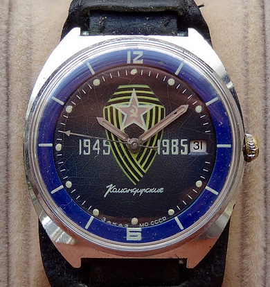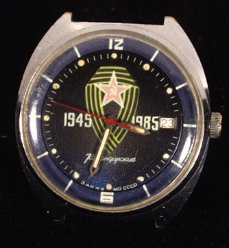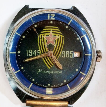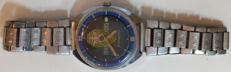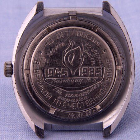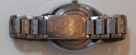 Avec un bracelet métallique, soviétique, à boucle déployante, aux maillons marqués de deux étoiles, avec une boucle commémorative estampée d’un drapeau soviétiques, d’une étoile à cinq branche frappée d’un 40 (pour les 40 ans de la victoire), avec au-dessus « 1945 » et en dessous « 1985 ». A l’inétieur de la boucle, la mention нерж сталь (acier inox).