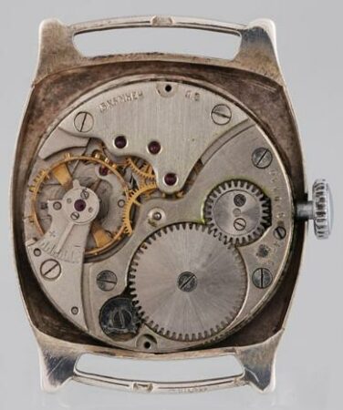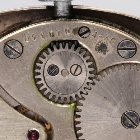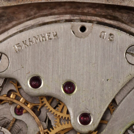 Marquage du mécanisme: n° de série (11070) et millésime (4-46) sur un pont et sur un autre: le PZ (ПЗ) de Penza, marquage typique des années 40, et 15 камня (15 rubis).