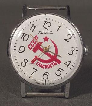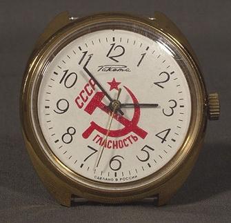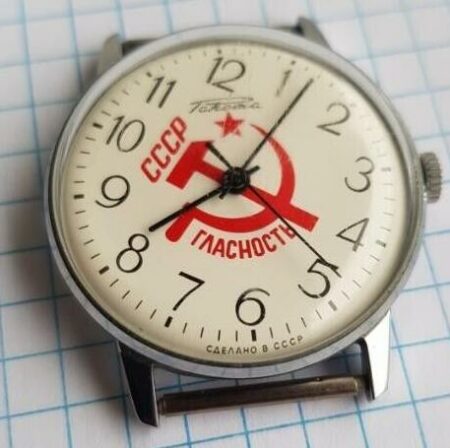 Motif sur le cadran : Marteau, faucille, « CCCP » (« URSS ») et « Гласность » (« Glastnost »)
