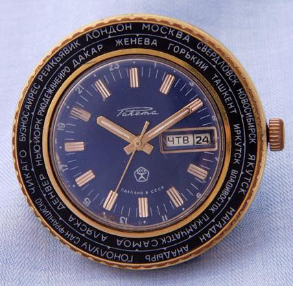 Remarque : Ce modèle de Raketa est dénommé « Goroda » (villes), parce qu’une lunette mobile, (ici extérieure) porte le nom de villes situées sur différents fuseaux horaires. Il suffit de placer le nom de la ville du fuseau où l’on se trouve pour savoir l’heure dans les autres villes en se référant à l’index de 24 heures.