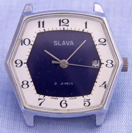Montre bracelet, mécanique, pour l’exportation, avec simple tantième, de la 2e Fabrique de Montres de MoscouMarque : Славa (Slava)Gravure sur le fond : 326223Mécanisme : Slava 2414 à 17 rubisDate de fabrication : Années ’80Entre-cornes : 18mm