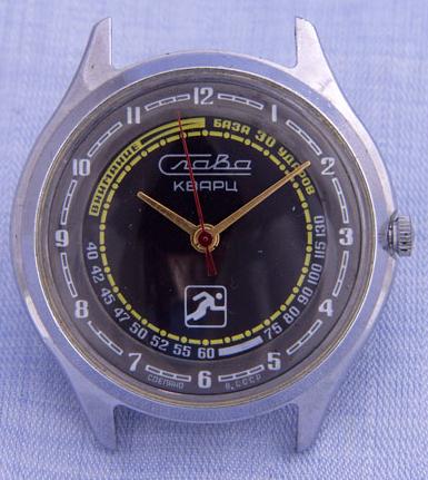 Mentions sur le cadran : кварц (au-dessus de l’axe des aiguilles), база 30 чаров (« base de 30 battements ») en haut à droite, sur le pourtour du pulsomètre, et cделано в cccp à six heures.