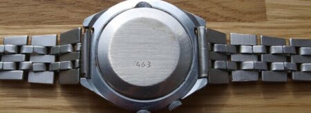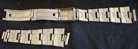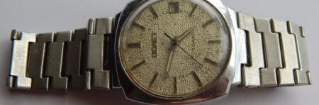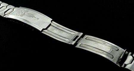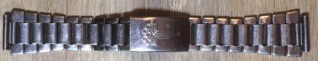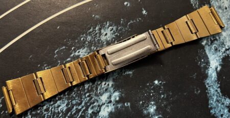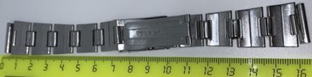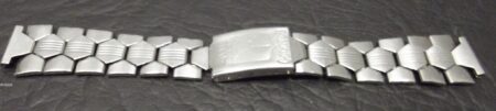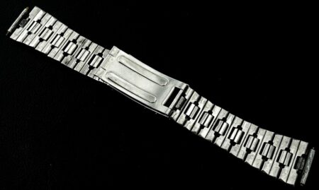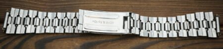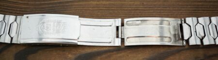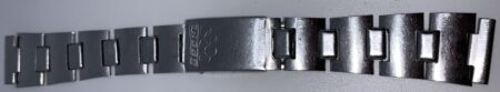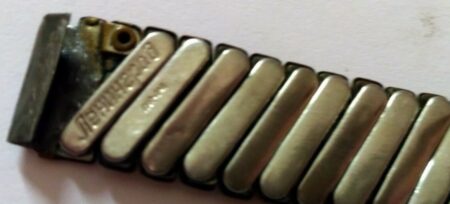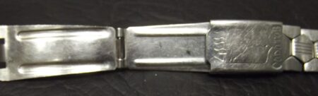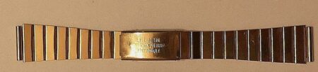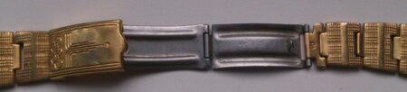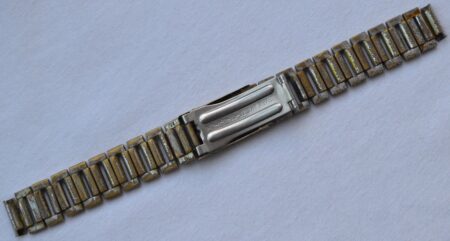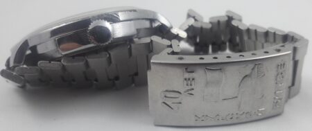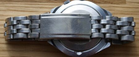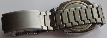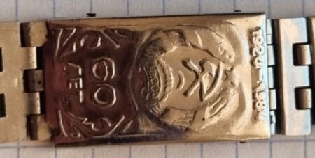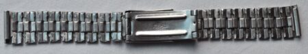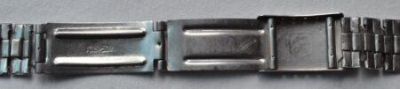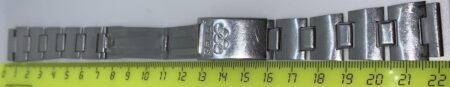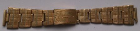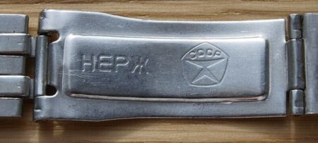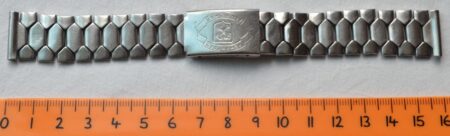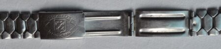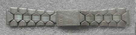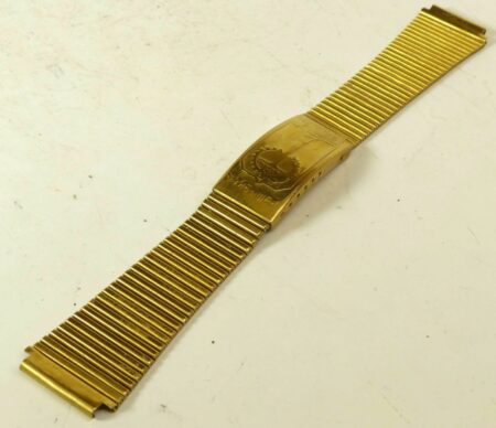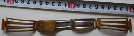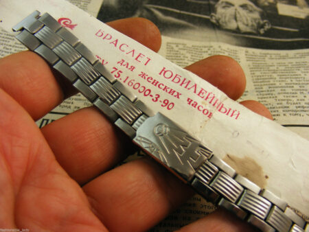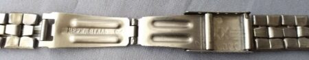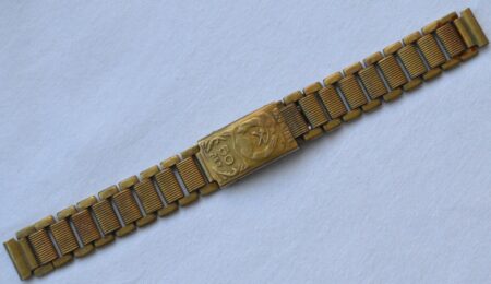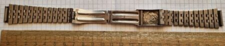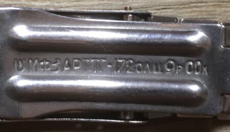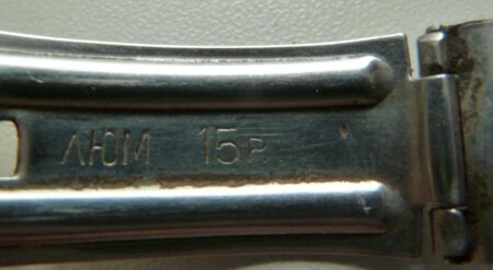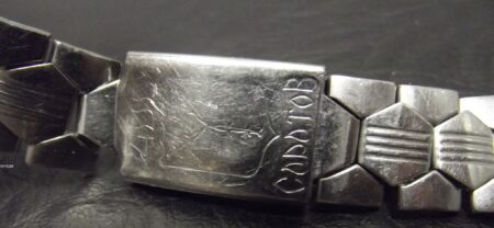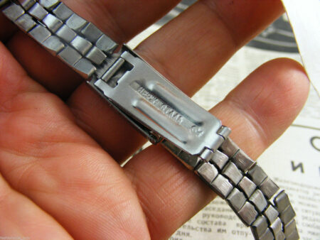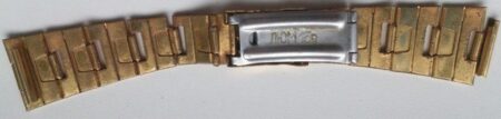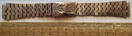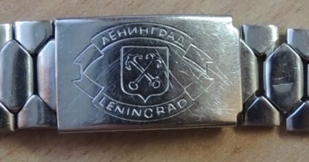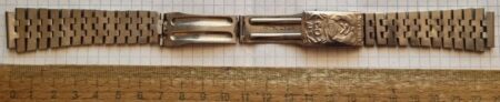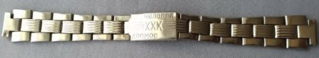 La même boucle frappée des armes de Léningrad mais avec un bracelet à maillons rectangulaires et avec, à l’intérieur de la boucle, la mention НЕРЖ (inox) et la marque de qualité de l’URSS.
