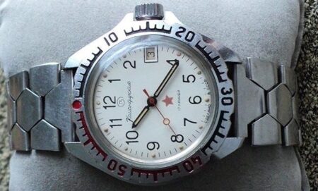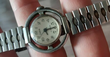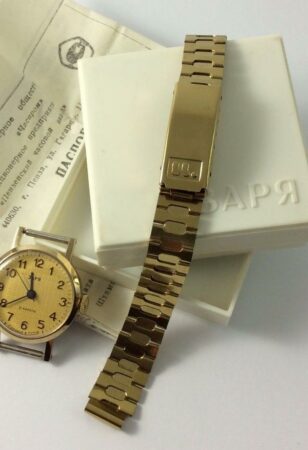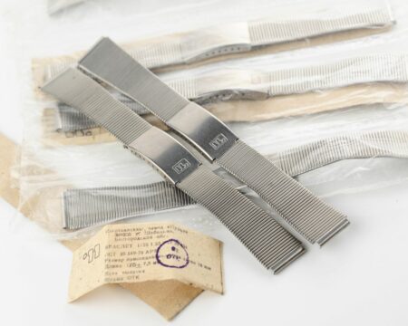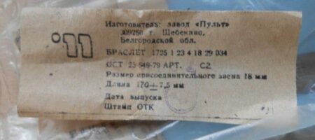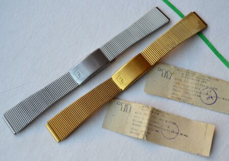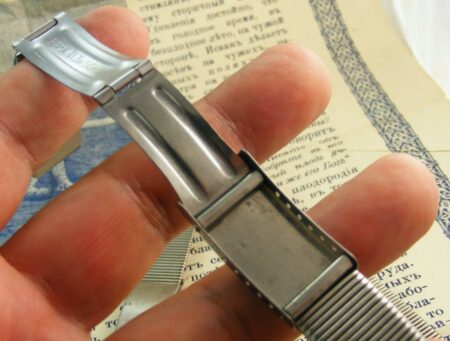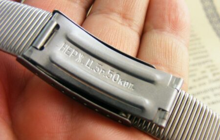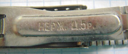 Bracelet à boucle déployante marquée à l’extérieur du 2e logo de la fabrique et à l’intérieur нерж (acier) et Ц4р50к (4 roubles 50 kopecks).