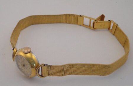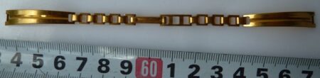 Beau bracelet métallique doré ajouré, d’époque et de fabrication soviétique, à boucle papillon, avec comme mention ЛЮМ Au sur une ligne et «Ч6P.80K » (prix 6 roubles 80 kopeks) sur la ligne du dessous. Strie à l’extérieur de la boucle.