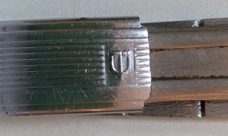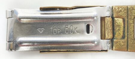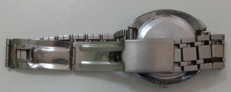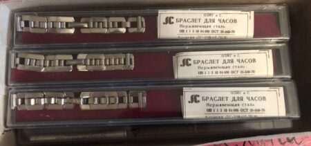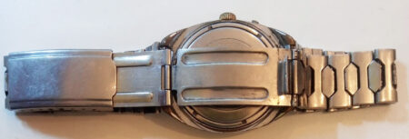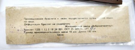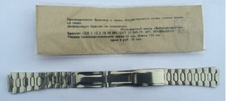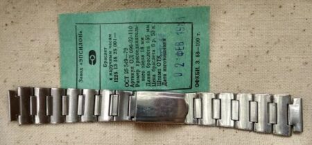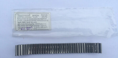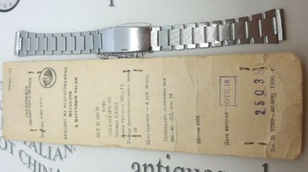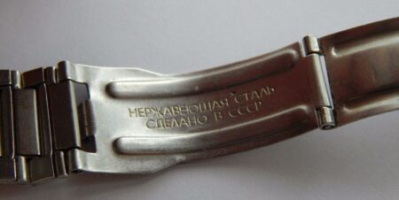 Un bracelet à boucle déployante, strié à l’extérieur et estampée à l’intérieur de la mention нерж (inox) et Ц6P.50K ( prix 6 roubles 50 kopecks).