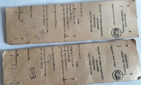 Bracelets produit par la section d’Odessa (Одесского УПО УТОС) de la Société Ukrainienne des Aveugles (Украинское общество слепых). La Société s’engageait notamment a trouver des débouchés professionnels aux personnes handicapées.