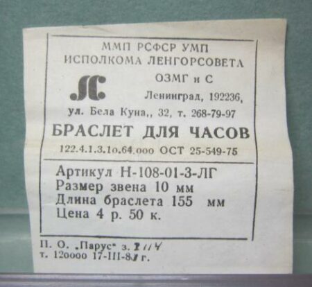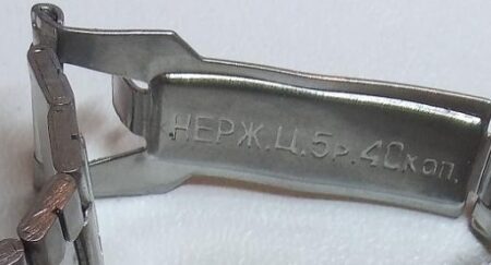 Un bracelet à boucle déployante avec la mention НЕРЖ (inox) et Ч.5P.40KOП. (prix 5 roubles 40 kopecks):