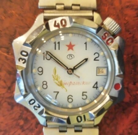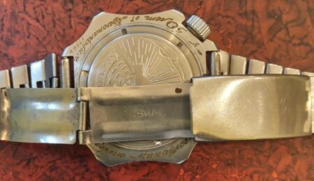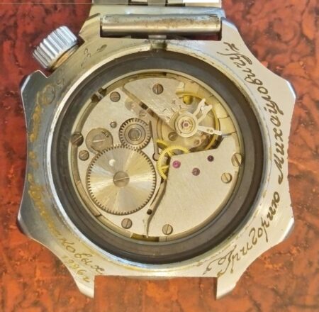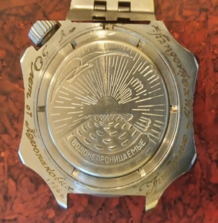 Gravure sur le fond : Fond de Komandisrkie (soleil, mouette et océan) avec mention водонепроницаemыe (étanche), n° 136011 + gravure personnalisée « В 50 лет от Колпаковых 1996 / Григорию Михайловичу » (50 ans de Kolpakov 1996 / Grigory Mikhailovich)