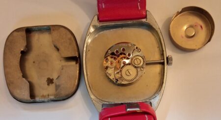 Mentions sur le calibre : 17 JEWELS sur un pont, logo Tchaïka sur la platine. Mécanisme strié.