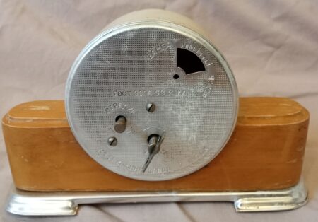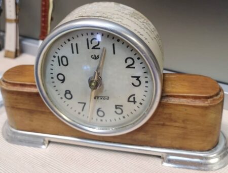 L’horloge de table est sur un socle de pin massif posé sur un pied de métal doré.