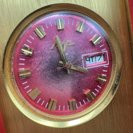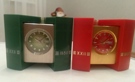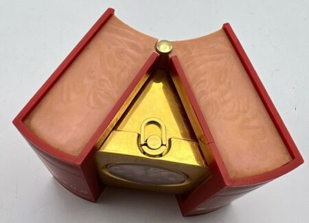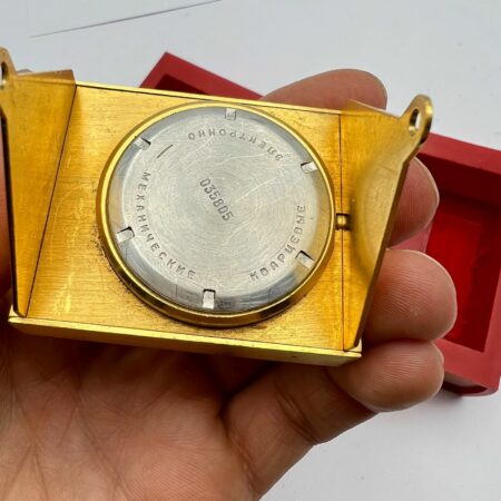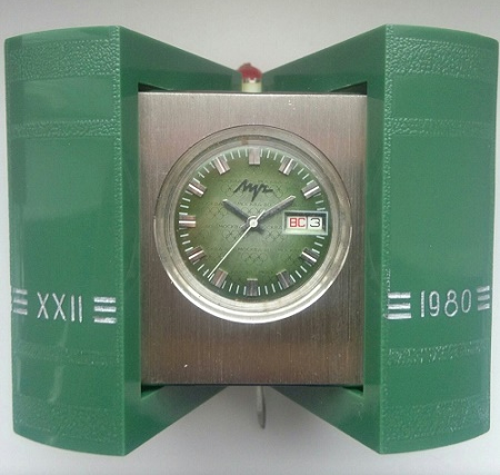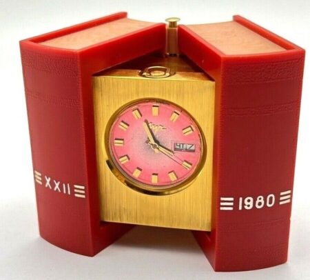 Horloge souvenir Fabrique de Montres de Minsk, en forme de livre, célébrant les Jeux olympiques de Moscou de 1980 avec sur le cadran le logo des jeux