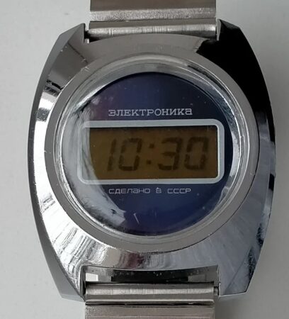 Montre-bracelet de la Fabrique Elektronika de MinskMarque: ElektronikaBoîtier en laiton chroméMécanisme: B6-02Produit dans les années ’70Dimensions de corne à corne: 42mmLargeur: 37mmEntre-cornes: 20mm