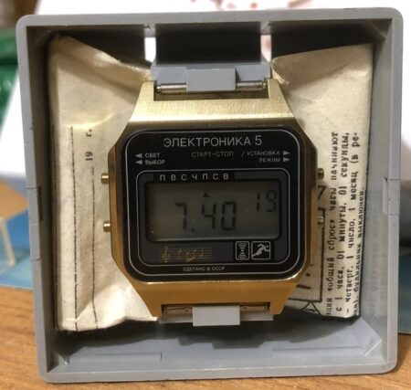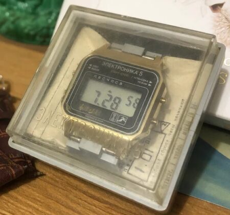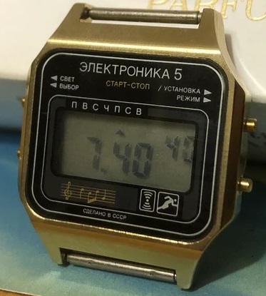 Montres à quartz de marque Elektronika 5 produite par la Fabrique Elektronika de Minsk du Combinat électronique « Integral »