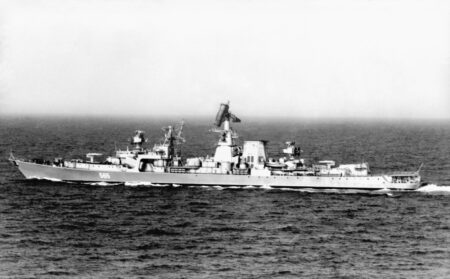 ВМФ (pour Военно-морской флот: marine de guerre) et motifs de ruban de Saint-Georges et de croiseur lance-missile de la classe Kara: