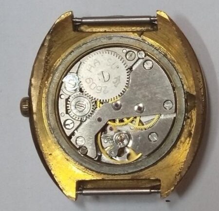 Mentions sur le calibre : logo Raketa (raquette symbolisée), 2609.HA et SU (Soviet Union) sur le rochet, marquage typique du début des années ‘90.