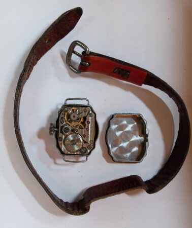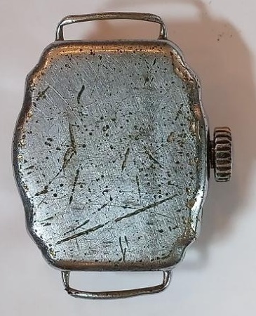 Mentions sur le calibre : N° de série (7335146) sur la tranche, 16 камней et logo de Penza (initiales dans un triangle) sur un pont et 1801 sur un autre ; ЗАРЯ et trois étoiles sur le rochet. Cotes de Genève.