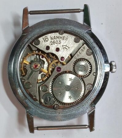 Mentions sur le calibre : n° de série (46723) sur un pont, logo de Raketa (la raquette symbolisée), 16 камней et 2603 sur un autre, cinq étoiles sur le rochet