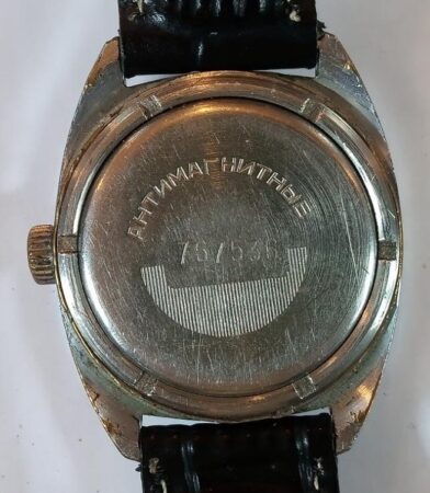Gravure sur le fond : Антимагнитных : antimagnétique en courbe au dessus, 767536 au centre, rayures en dessous