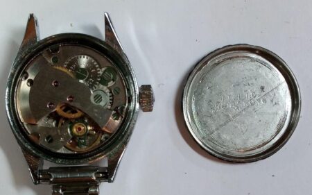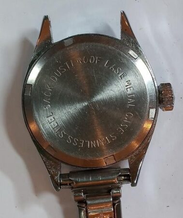 Gravure sur le fond : BASE METAL STEEL STAINLESS BACK DUSTPROOF, en cercle