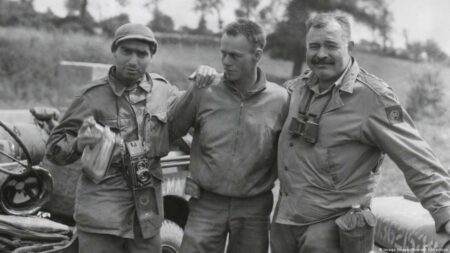 Ci-dessous, Robert Capa avec Ernest Hemingway, qu’il connaissait depuis la guerre d’Espagne, en France en juillet 1944: