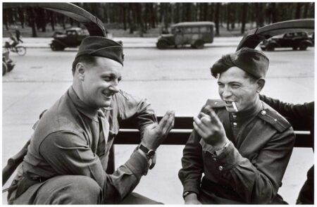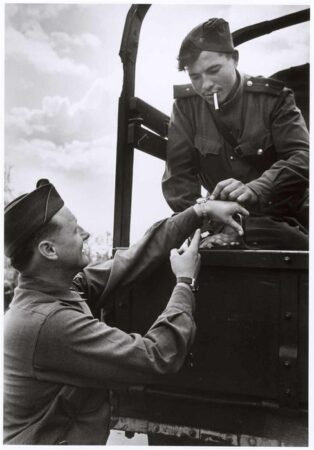 Sur ces photos de Robert Capa, prise à Berlin en juin 1945, un soldat soviétique achète (ou troque) une montre à un soldat américain (qui en porte une à chaque poignet, ce qui laisse supposer, de ce côté là aussi, quelque prise de guerre…).