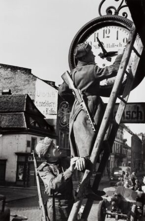 Deux soldats soviétiques mettent l’horloge du magasin de l’horloger Martin Halisch sur la place du marché dans la ville polonaise de Środa Śląska en basse Silésie, à une trentaine de kilomètres de Wrocław, qui, avant 1945, était en Allemagne. Il y a un impact de balle dans le cadran. Un soldat porte un fusil Mosin-Nagant, l’autre un pistolet-mitrailleurs PPSh-41.