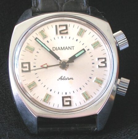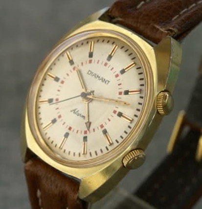 Montre bracelet à alarme, fabriquée en France par la Société anonyme Slava (Besançon) avec un calibre la 1ère Fabrique de Montres de Moscou.