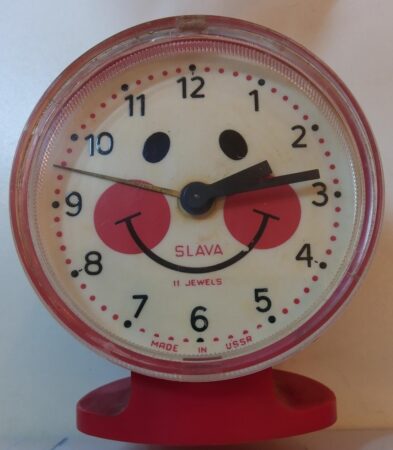 Petit réveil de marque de la 2e Fabrique de Montre de Moscou pour l’exportation.Marque Slava, mécanisme 5671 à 11 rubis.Produit dans les années ’80Largeur/diamètre: 7cmHauteur: 9cm