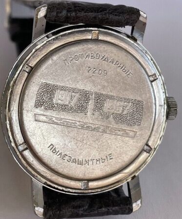 Gravure sur le fond : image de Léningrad et « 1917 1967 », « 2209 » et les mentions противоударные (antichoc) et пылевлагозащитные (étanche à l’eau et à la poussière) en cercle