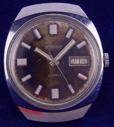 Montre bracelet, automatique, à double tantième, pour l’exportation en Turquie, de la Fabrique de Montres de Tchistopol.Marque : SerkisofBoîtier de laiton chroméMécanisme : calibre 2427 à 21 rubisN° de série: 006 217242