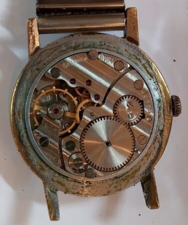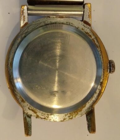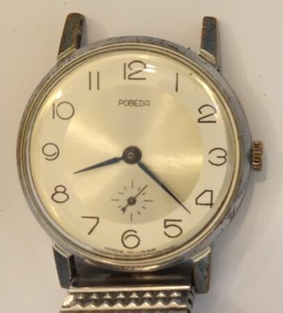 Bracelet métallique soviétique de type filoflex, rare !, marqué нержакеютаяст (acier inoxydable) sur un maillon, et ц5р. (prix : 5 roubles) avec un logo en forme de couronne renversée sur un autre. Arrivé avec la montre.