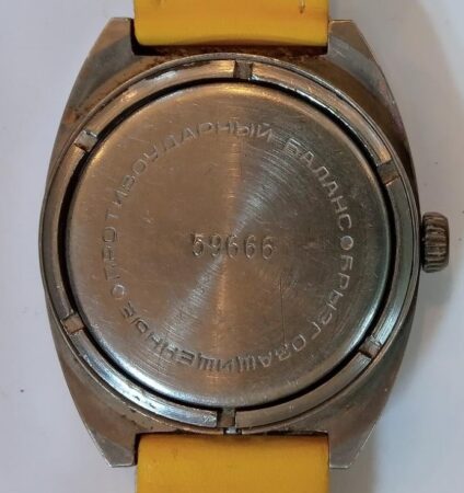 Gravure sur le fond : 59666 au centre et en cercle : противоударные бaлaнз (mouvement antichoc) пылевлагозащищенные (étanche à l’eau et à la poussière)
