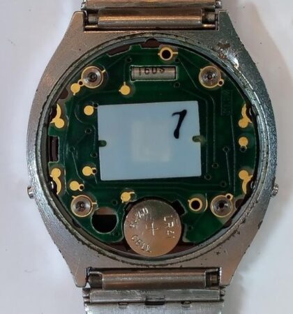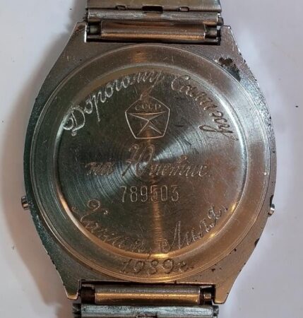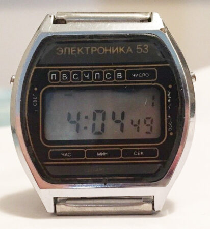 Au dessous de l’écran : deuxième ligne : час (heure), мин / cek (minutes/secondes) et en dessous encore : cделано в cccp