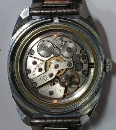 Mentions sur le calibre : Logo de la fabrique sur un pont, 21 камней sur un autre, 2414 sur la platine