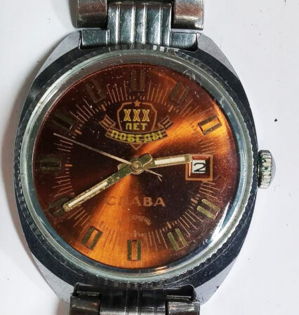 Cadran cerise avec un blason marqué XXX лet Победа (XXXe anniversaire de la victoire) avec un ruban de Saint Georges