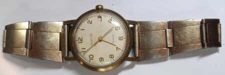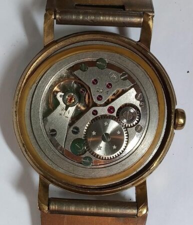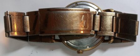 Bracelet soviétique, de métal doré, à boucle déployante marquée à l’extérieur du logo de la Fabrique de pièces de montres de Vitebsk, et à l’intérieur de Ц8P. ( prix 8 roubles):