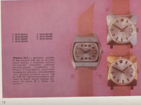 Mentions sur le calibre : N° de série sur la platine, logo de Raketa (la raquette symbolisée), 2614 et et 19 камней (19 rubis) sur le pont
