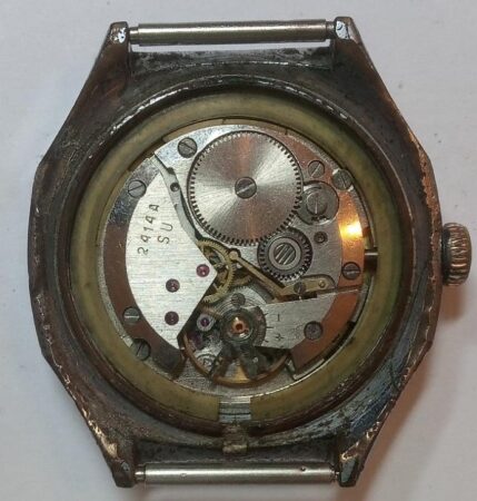 Mentions sur le calibre : SU (pour Soviet Union) et 2414 sur un pont, logo Vostok sur la platine