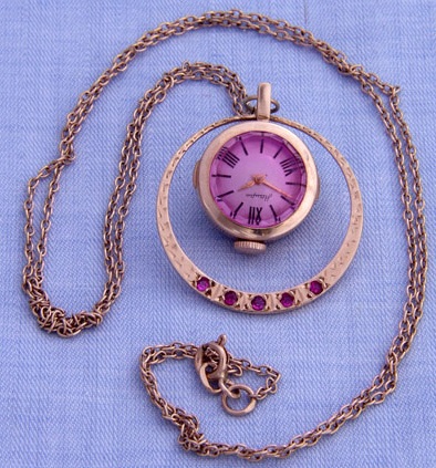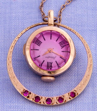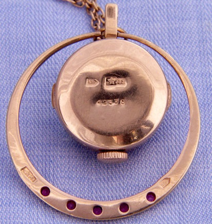 Montre-pendentif pour dame en or massif de la Fabrique Horlogère d’Erevan avec un mécanisme de la Fabrique de Montres d’Ouglitch et cinq rubis naturels enchâssés.