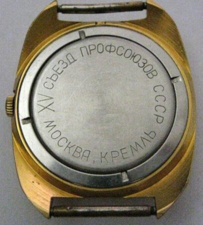 Cadran champagne à index de métal doré apposé, avec la mention : MADE IN URSS.