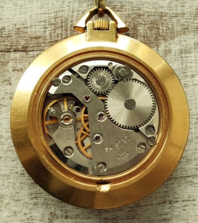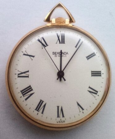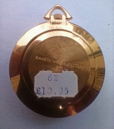 Un autre exemplaire produit entre entre 1970 et 1975, vendu avec une chaine de 17cm. Son dos est marqué RAKETA WATCH FACTORY / USSR