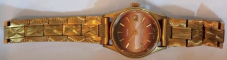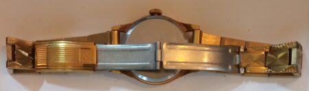 Bracelet de métal doré, à boucle déployante frappée du logo de la Fabrique de pièces de montres de Vitebsk, avec des motifs géométriques sur les maillons.