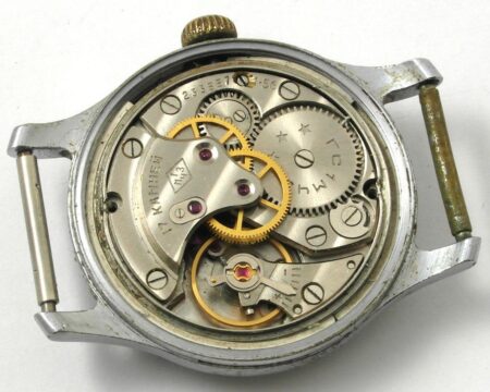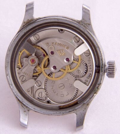 Mentions sur le calibre : 4-56 (4e trimestre 1956), logo de l’usine (initiales 1MЧЗ dans un losange), ГC1MЧЗ et trois étoiles sur la roue à rochet, 17 камней (17 rubis), côtes de Genève.