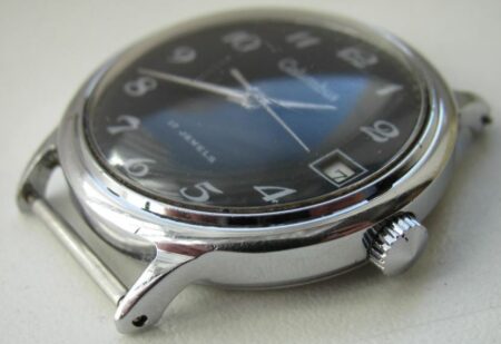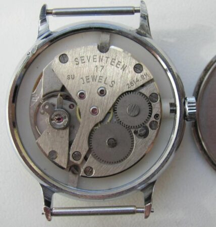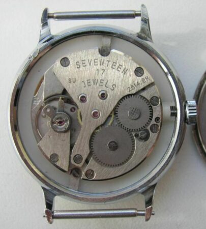 Mentions sur le calibre : SU (pour Soviet Union) SEVETEEN 17 JEWELS et 2614.2H sur le pont.