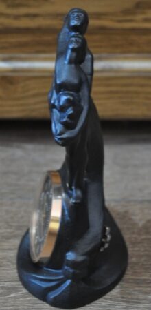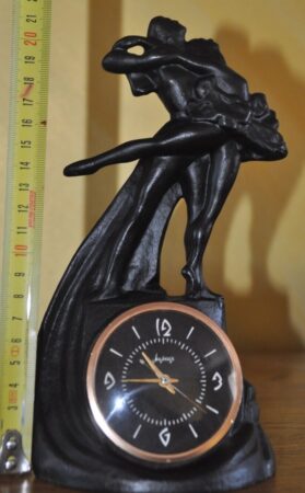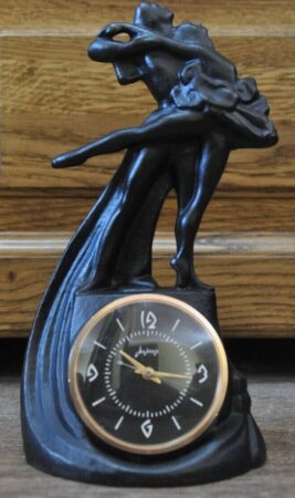 Cette horloge est le fruit de la coopération entre la Fabrique de Montres de Tchéliabinsk et de la Fabrique de Kasli, deux fabriques voisines situées dans l’Oural.Marque: Molnija (« Éclair »),Son mécanisme est un 57128.Fabrication: 1968