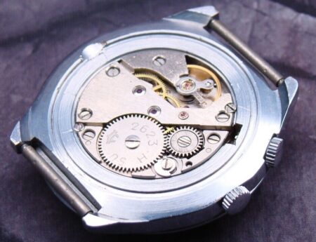 Mentions sur le calibre : 2623.H, SU et logo Raketa (raquette symbolisée) sur le rochet.