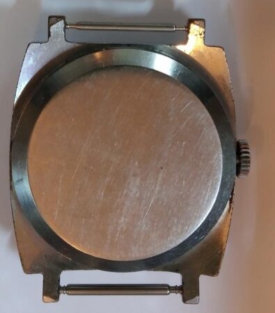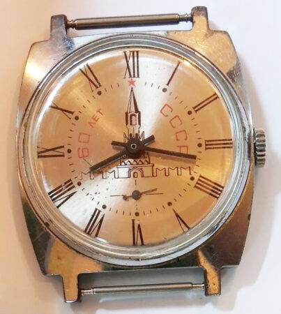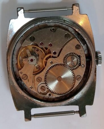 Le mécanisme de cet exemplaire a été remplacé par un mécanisme de la même fabrique, du même modèle et de la même époque. Le bracelet est un trench soviétique de fin cuir noir (NOS).