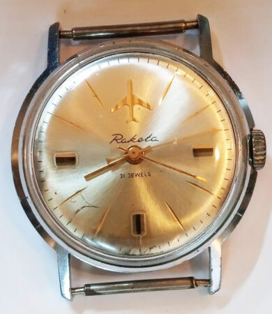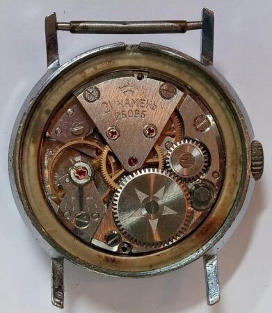 Mentions sur le calibre : N° de série (57497) sur la platine, logo de Raketa (la raquette symbolisée), 2609Ƃ. Et 21 камней (21 rubis) sur le pont